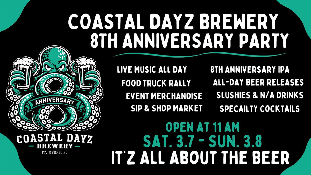 Coastal Dayz Brewery is turning 8 on March 7th and we are pulling out all the stops for this memorable milestone!Coastal Dayz Brewery 2161 McGregor Blvd - Downtown Ft MyersSaturday March 7th Open @ 11am! (Day one) (Free to Attend!) (11am - 12am) (Sunday 11-9pm) (Day Two)Drinks