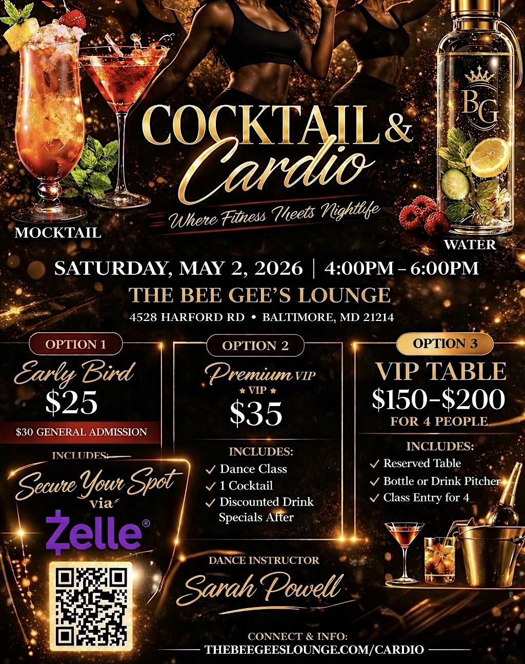Join us at The BeeGee's Lounge on May 2, 2026 at 4:00 PM (Eastern Time) for a fun mix of great drinks and heart-pumping cardio! Whether you're here to sip or sweat, this event is all about good vibes and good company. Come ready to move, mingle, and make the most of your afternoon. Don’t miss out on this unique combo of fitness and fun!