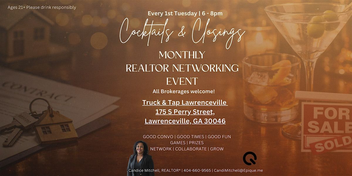 Cocktails & Closings is a monthly networking mixer created for agents who want to build real relationships — not sit through presentations or endure awkward sales pitches.
