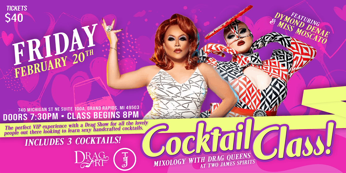 Join us on February 20th for an interactive and entertaining evening where expertly crafted cocktails meet high-energy drag performances. Doors open at 7:30 PM, giving you time to get settled, grab a seat, and soak in the vibes before the class kicks off promptly at 8:00 PM.