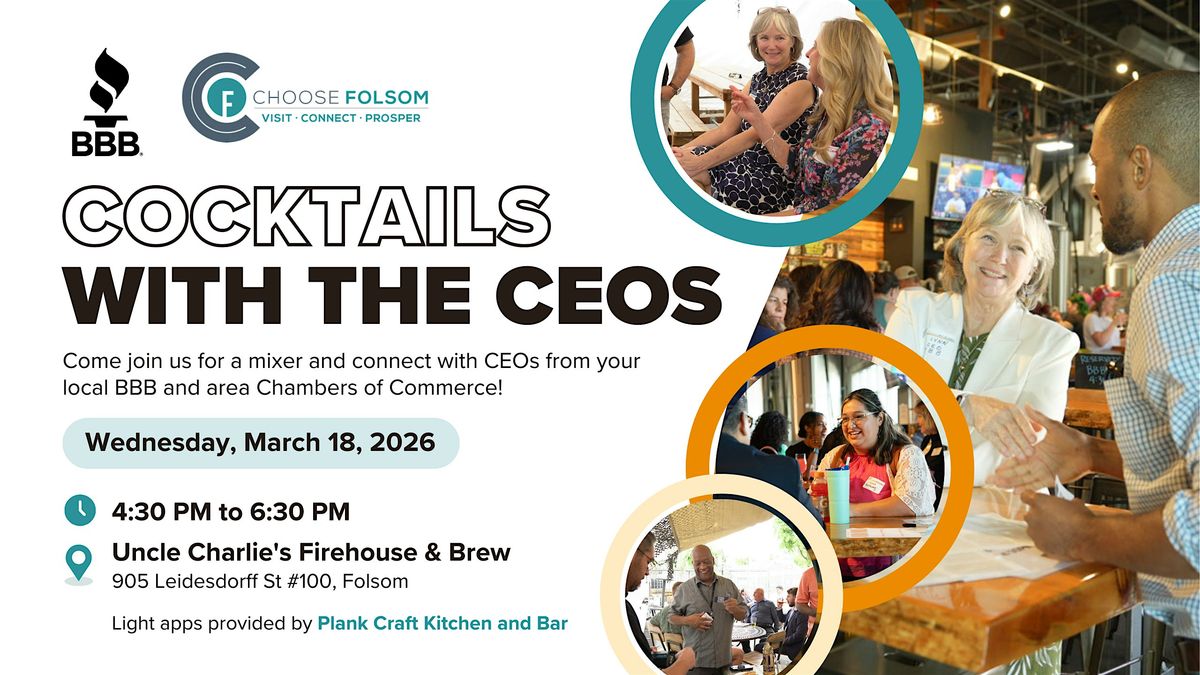 BBB's first Cocktails with the CEOs of 2026 will be March 18th, 4:30 to 6:30 PM, at Uncle Charlie's Firehouse & Brew in Folsom. All are welcome - BBB membership not required.