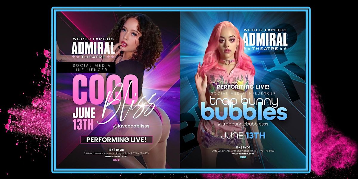 Chicago nightlife and social media culture collide as viral influencer Coco Bliss headlines a special live appearance at the legendary Admiral Theatre, joined by internet personality Trap Bunnie Bubbles.