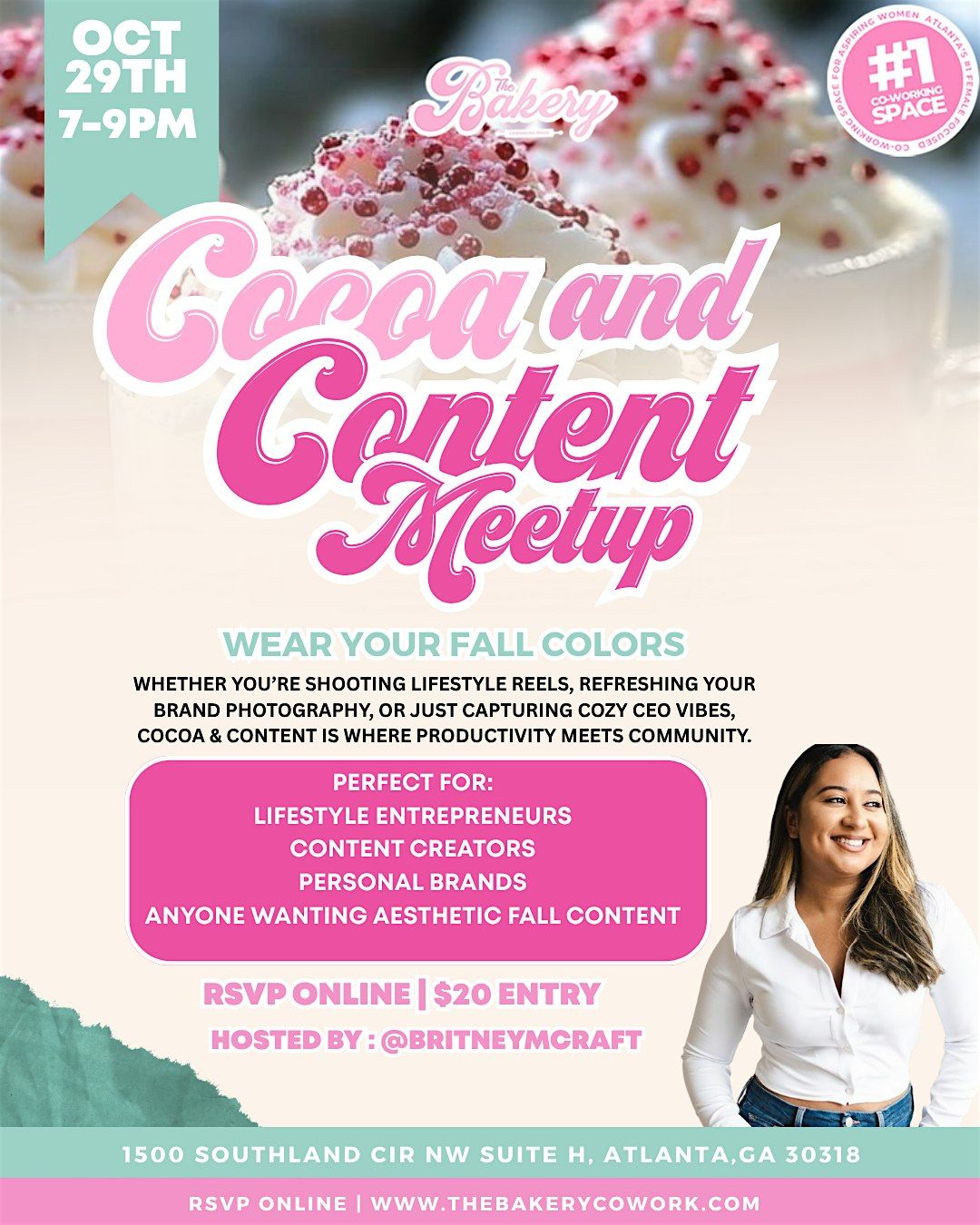 Welcome to Cocoa and Content Meetup happening at The Bakery CoWork! Join us on October 29, 2025 at 7:00 PM for a evening filled with fun, music, and mingling. Don't miss out on the opportunity to meet new people and enjoy a festive atmosphere. See you there!