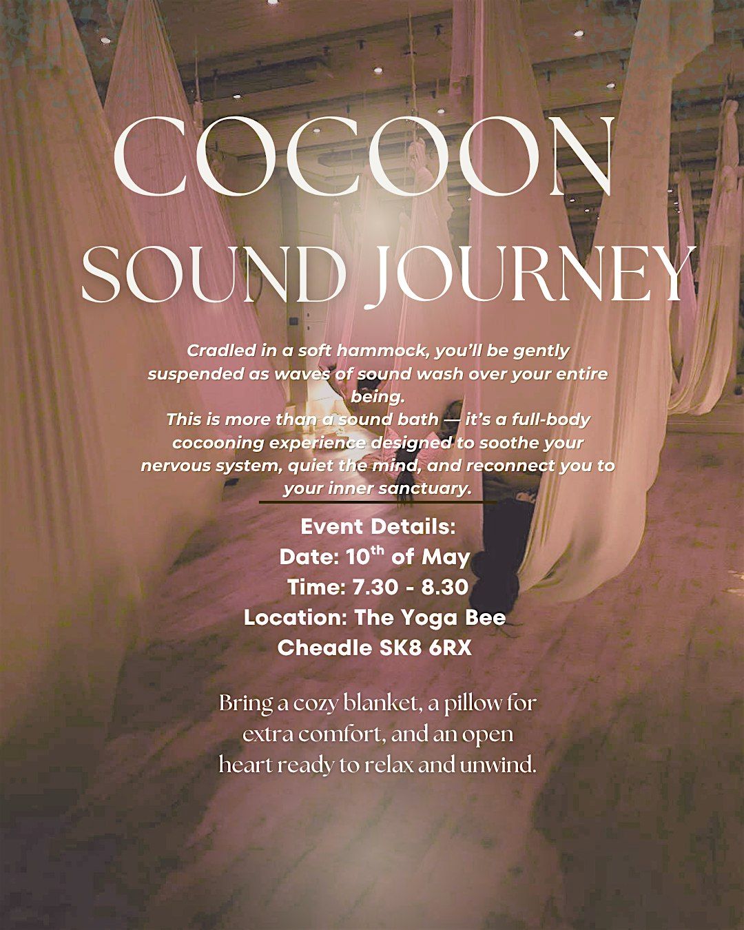 Cocoon Sound Journey is your perfect escape! Join us in person for an immersive experience where soothing sounds wrap around you like a cozy blanket.Give yourself the opportunity to relax and take a moment of peace and calm and feel the benifits long after the sound journey is over.