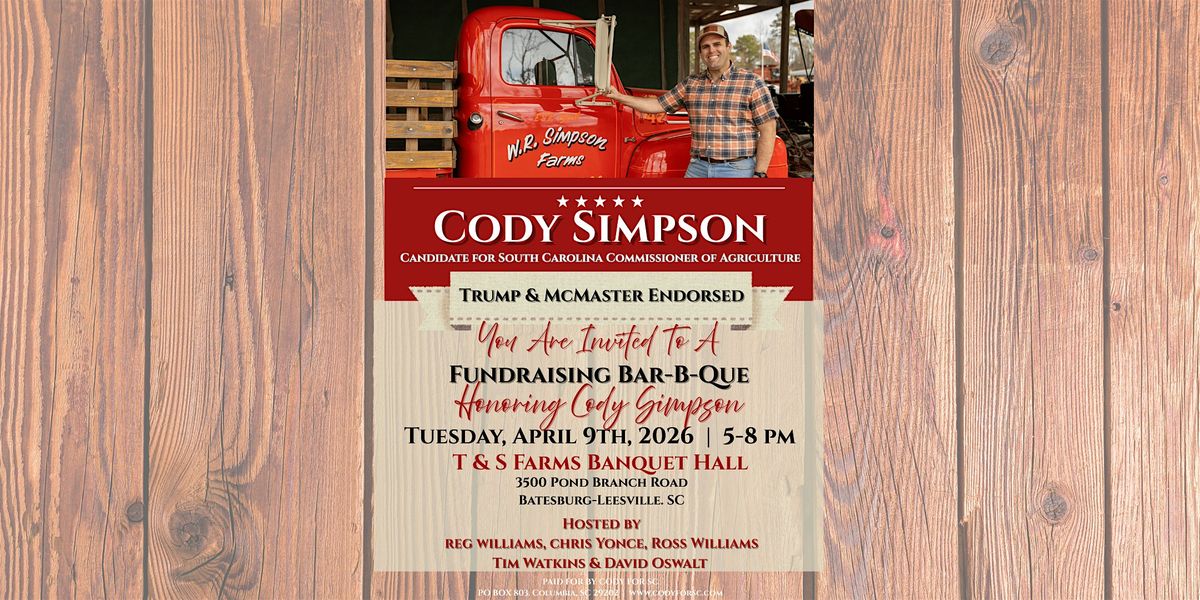 Join us on April 9th, 2026 at 5:00 PM for a relaxed, family‑friendly Casual BBQ Fundraiser in support of Cody Simpson, candidate for South Carolina Commissioner of Agriculture. Hosted at the T & S Farms Banquet Facility in Batesburg‑Leesville, this gathering brings together neighbors, community leaders, and supporters who care deeply about the future of South Carolina’s agricultural economy.