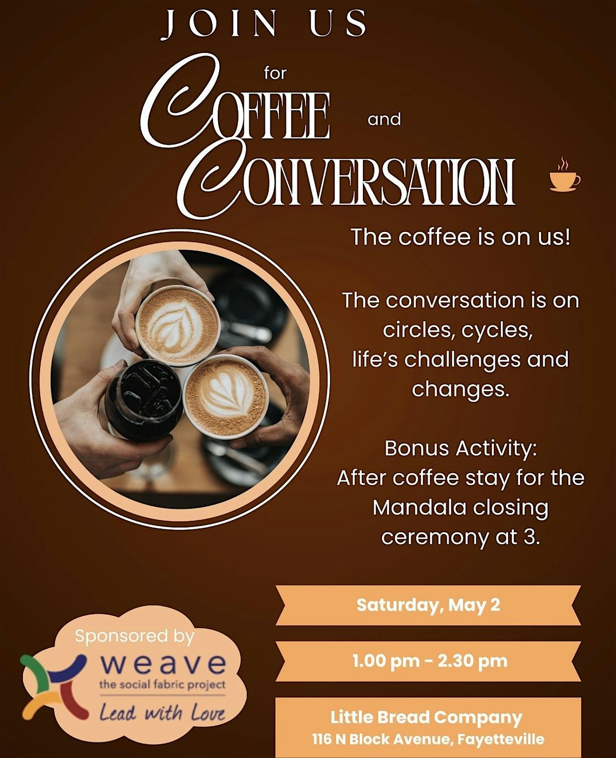 Join us for a relaxed afternoon at Little Bread Company on May 2, 2026 at 1:00 PM (Central Time). It’s the perfect chance to grab a cup of coffee, chat, and meet new friends in a cozy spot. We'll be discussing the curve balls that life can throw us during times of change and transition with a mandela creation surprise at the end. Come as you are. Coffee is on us!