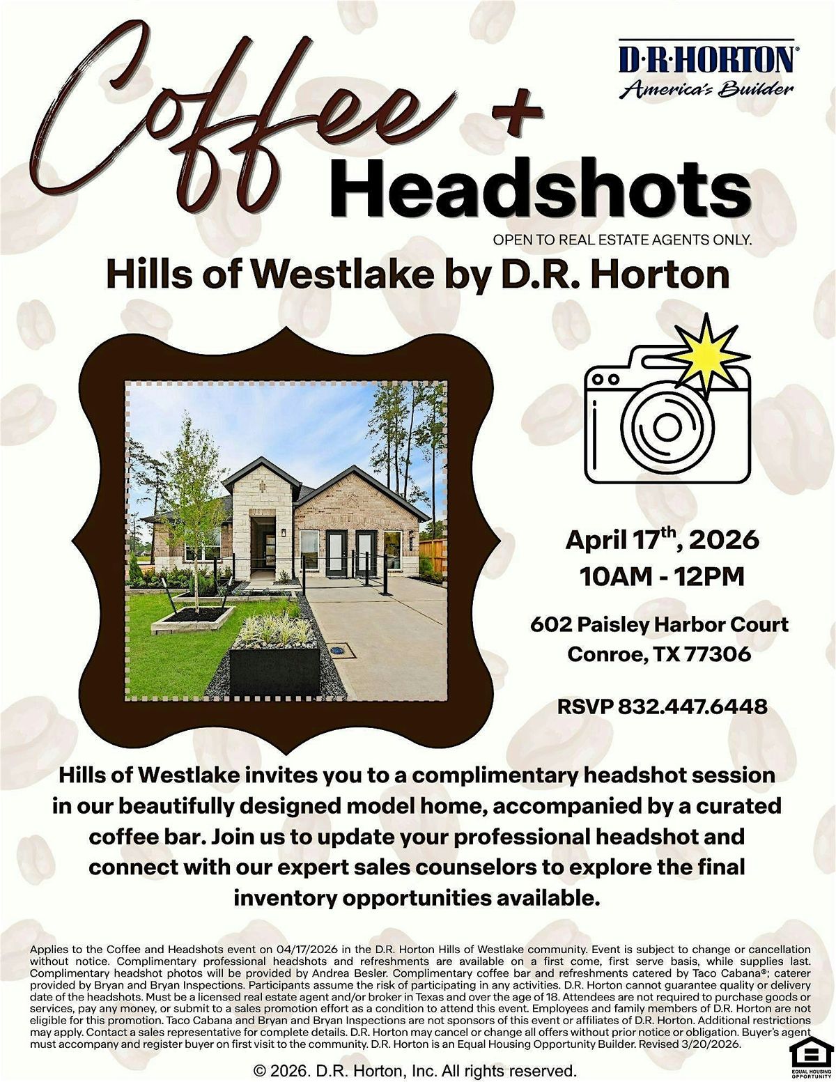 Hills of Westlake invites you to a complimentary headshot session in our beautifully designed model home, accompanied by a curated coffee bar. Join us to update your professional headshot and connect with our expert sales counselors to explore the final inventory opportunities available.