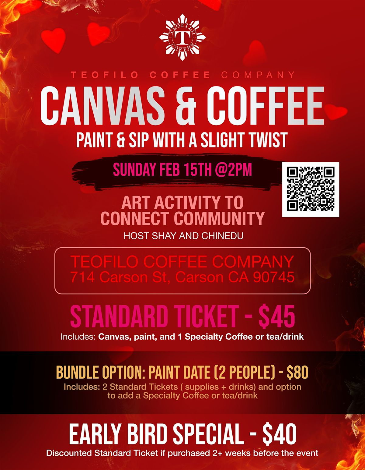 Hosts Shay and Chinedu will lead you through painting and connecting with community. Enjoy a handcrafted beverage made with Teofilo Coffee