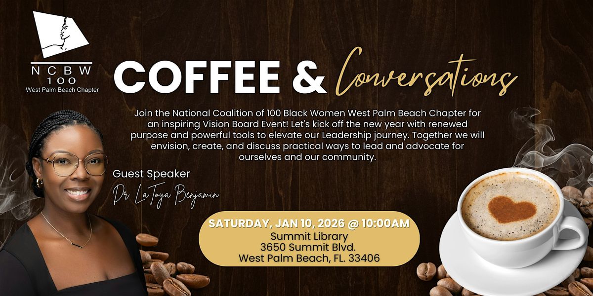 Join the National Coalition of 100 Black Women – West Palm Beach Chapter for Coffee & Conversations, an inspiring vision board gathering designed to kick off the new year with clarity, purpose, and community. We’ll gather to reflect, dream boldly, and discuss practical ways to strengthen our leadership and advocacy personally and collectively.