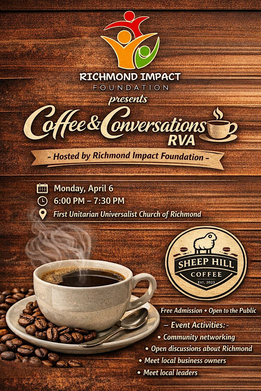 Join us for an evening of meaningful dialogue, community connection, and fresh coffee at Coffee & Conversations RVA, hosted by the Richmond Impact Foundation.