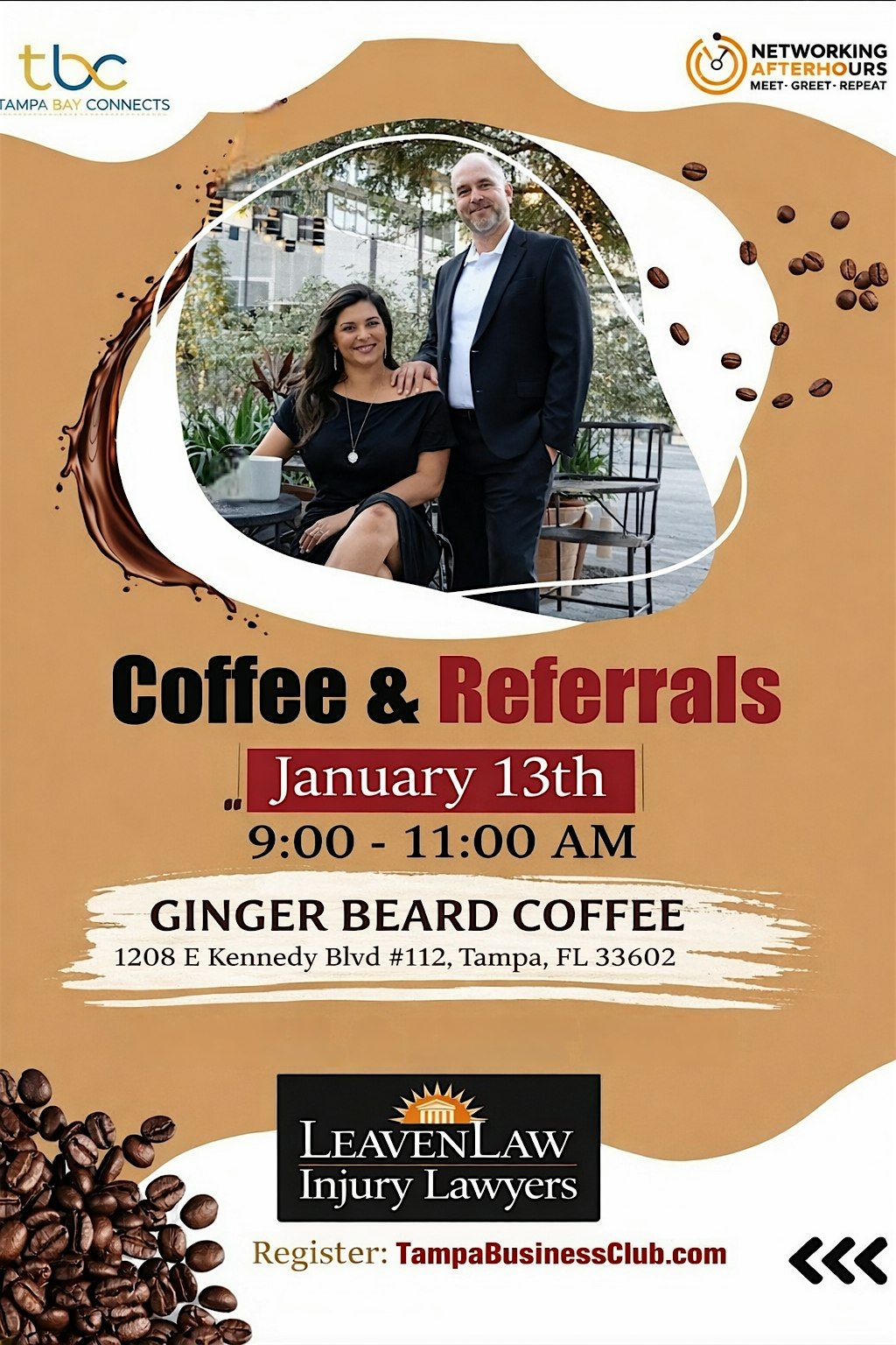 Welcome to the Coffee & Referrals Networking Social happening at Ginger Beard Coffee Downtown! Join us on Tue Jan 13 2025 from 9-11am for a morning of networking, delicious coffee, and making new connections. This in-person event is the perfect opportunity to meet other professionals, exchange referrals, and enjoy a cup of coffee at one of the coolest spots in town. Don't miss out on this chance to expand your network and grow your business. See you there!