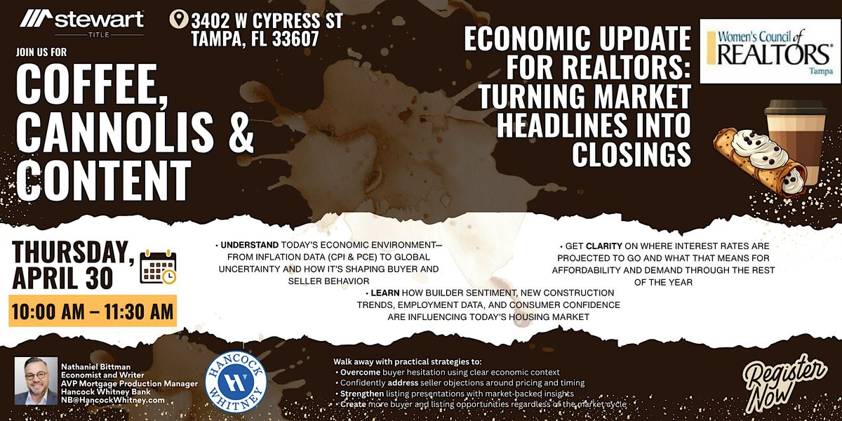 Join us for an engaging in-person session where we will analyze the latest economic trends and demonstrate how to transform those headlines into successful closings. Whether you aim to enhance your market knowledge or discover innovative ways to connect with clients, this event is filled with practical tips and real-world insights. Don’t miss this opportunity to elevate your business and stay ahead in the industry!