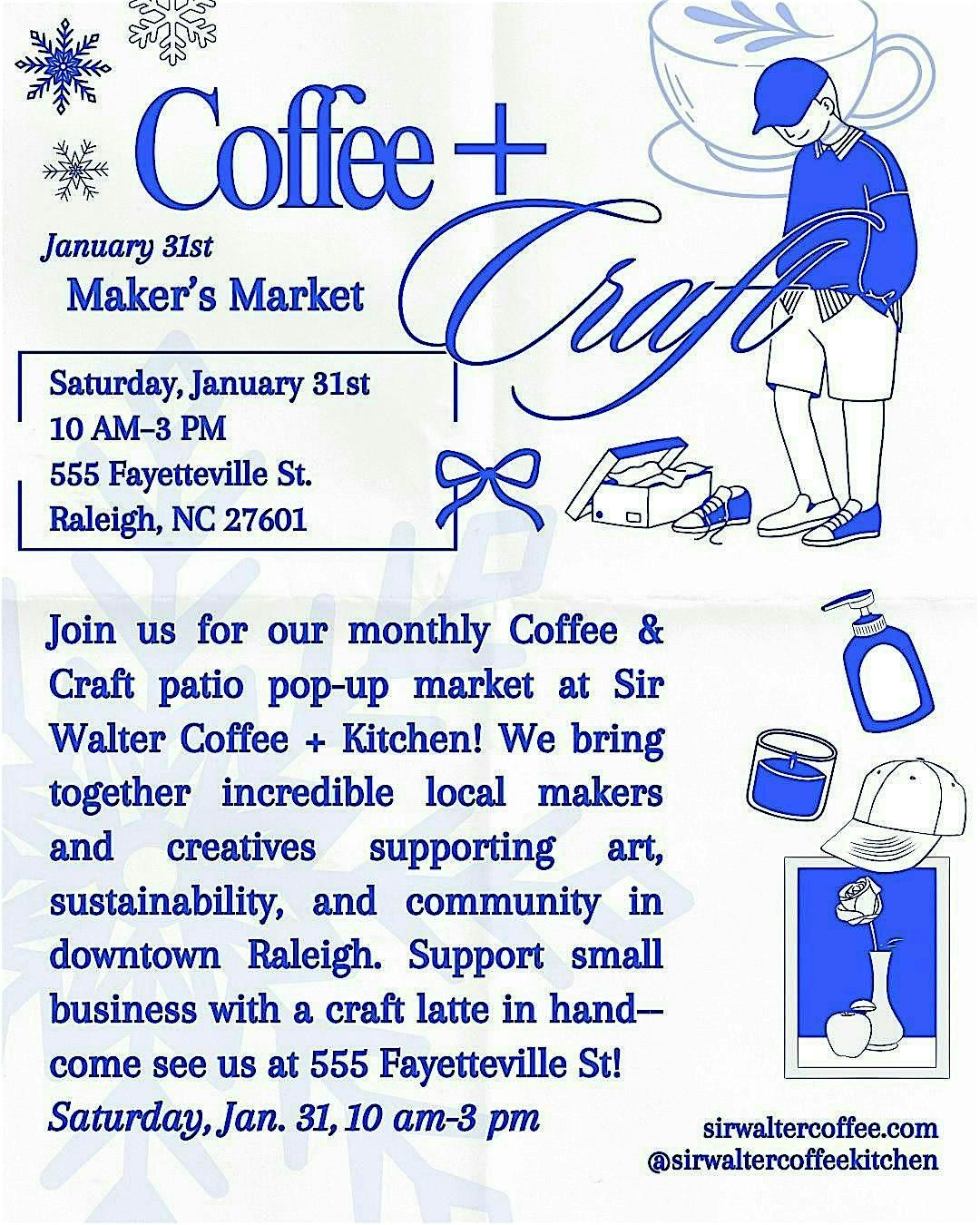Join us for our monthly Coffee & Craft patio pop-up market at Sir Walter Coffee + Kitchen! We bring together incredible local makers and creatives supporting art, sustainability, and community in downtown Raleigh. Support small business with a craft latte in hand--come see us at 555 Fayetteville St!