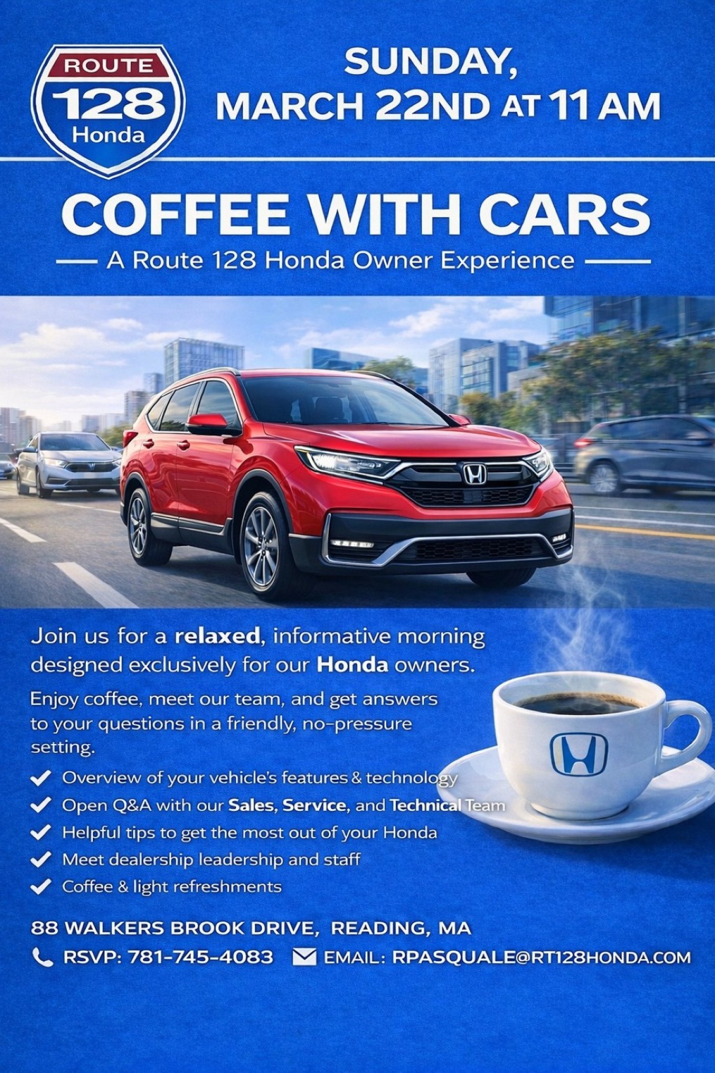 Our last session was a huge success — so we’re bringing it back on Sunday March 22nd at 11 am at Route 128 Honda.