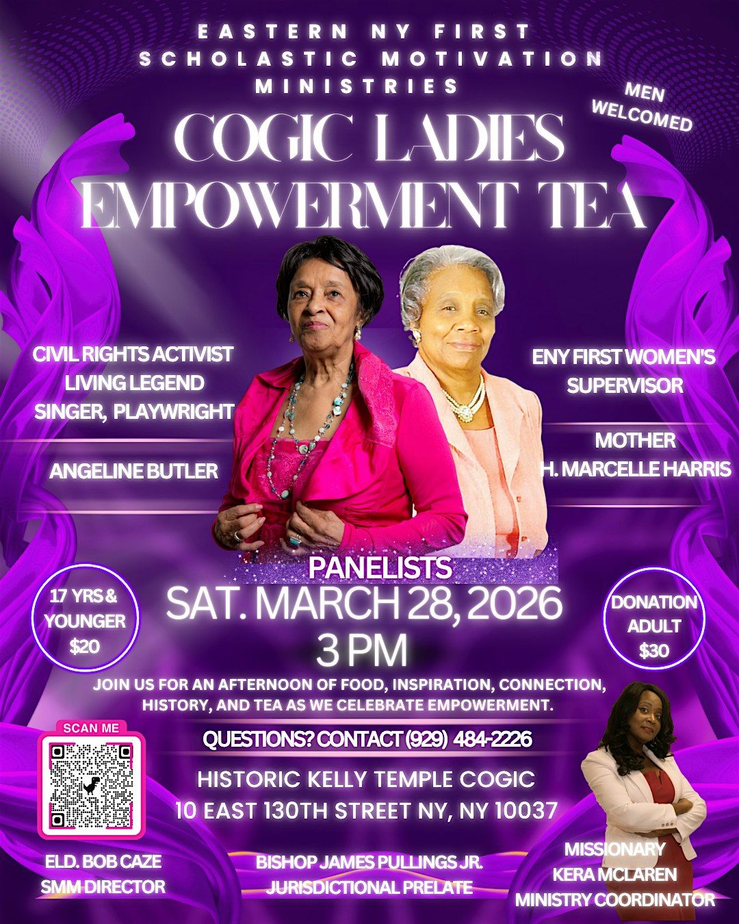 Join us for a delightful afternoon of wisdom and tea at the Historic Kelly Temple in New York, NY, USA. This event is for everyone of all ages and genders. All are welcome to attend this fundraising event. Come and enjoy an afternoon filled with inspiration, fellowship, hors-d'oeuvre, and, of course, delicious tea! Get ready to be empowered and uplifted as we hear History/Her-story from panelists, Civil Rights Activist, singer, and playwright Angeline Butler, and our Jurisdictional Supervisor, Mother Marcelle Harrs, as well as other guests, and engage in meaningful conversations and etiquette. Don't miss out on this opportunity to connect with other amazing COGIC ladies and leave feeling refreshed and inspired. All are welcome to attend this fundraising event. Men attend too. Bring a young person with you. This fundraising event is for everyone of all ages and genders. We can't wait to see you there!