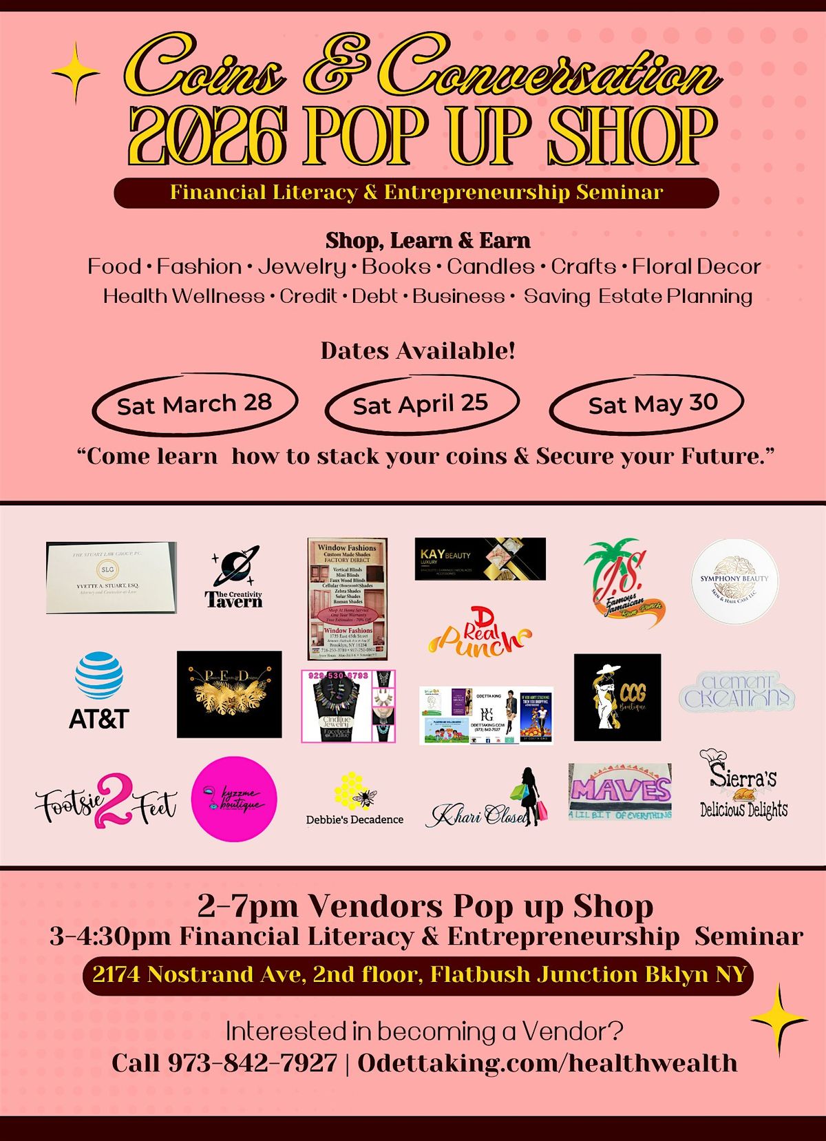 Welcome to the Coins & Conversation Pop Up Shop! Come join us for a fun-filled day shopping, networking at 2174 Nostrand Ave, 2nd floor in the buzy bustling heart of flatbush junction, Brooklyn NY 11210. The #2 & #5 train to flatbush junction stops directly infront the building.