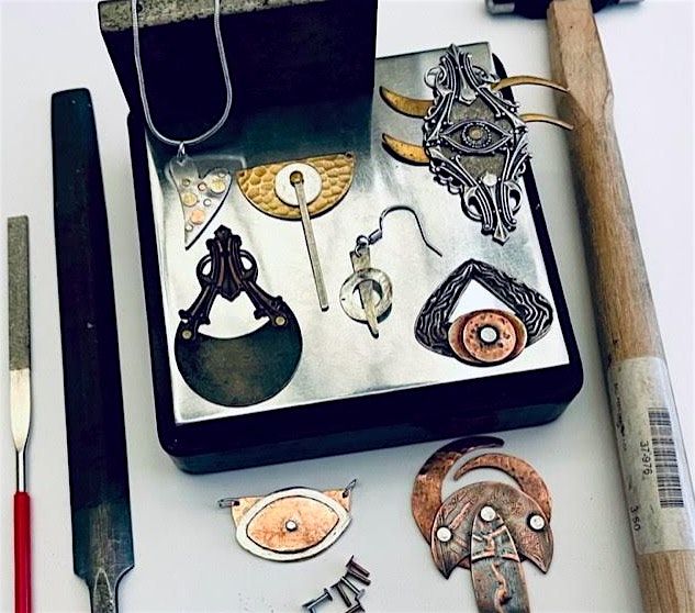 Riveting is a useful cold connection skill for layering elements that won’t withstand fire. In this class you’ll learn how to layer, and rivet pre-cut metal shapes and found objects with a standard, tack head rivet while exploring which materials are great candidates for cold connections. Class will cover architectural planning, piercing, filing, and finishing. The class project can be either earrings and or a pendant.