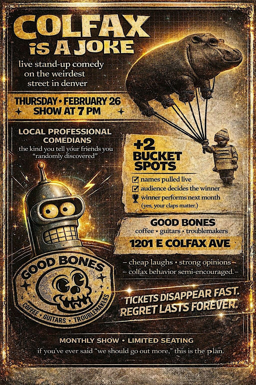 Colfax Is a Joke is a monthly stand-up comedy show featuring touring and locally beloved professional comedians, hosted by Hannah Gray, and built for people who want a real comedy show without the stiff comedy-club energy.