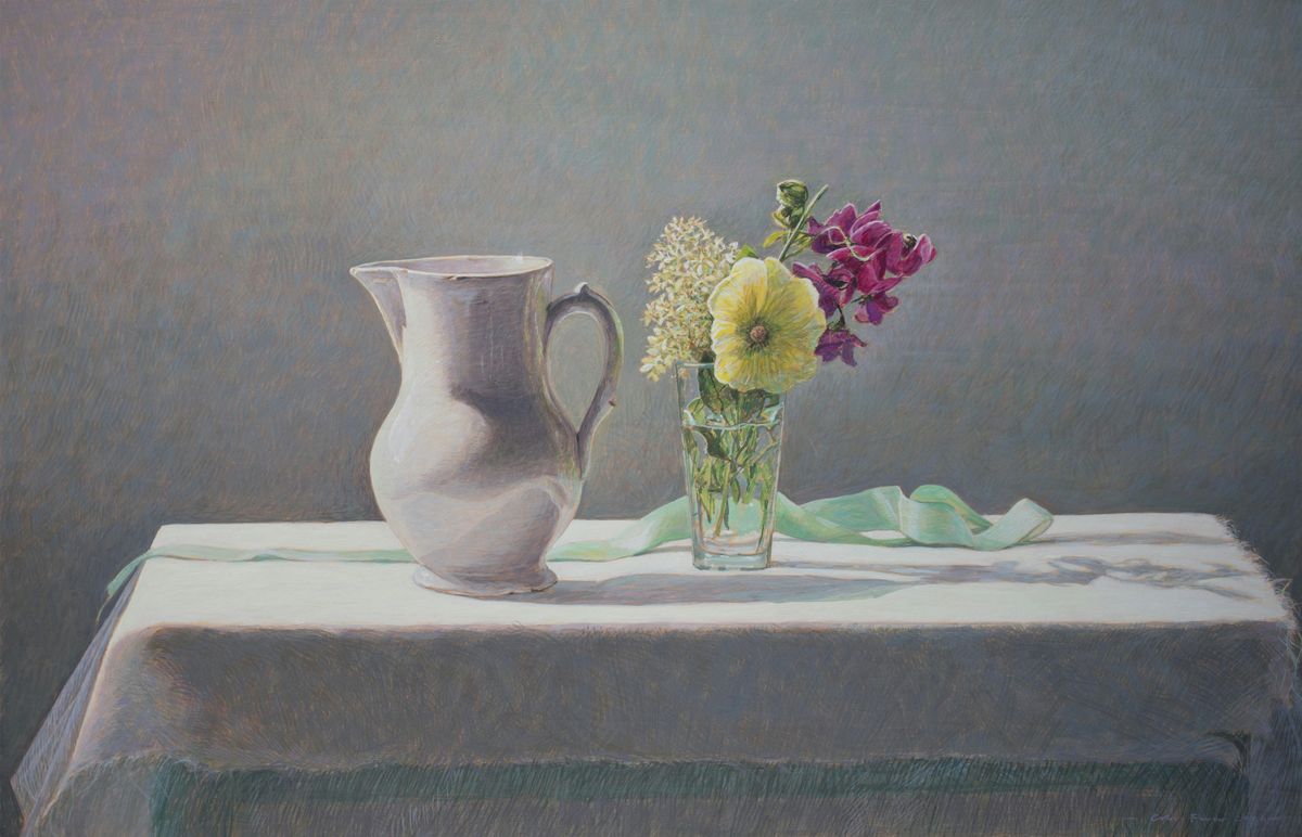 Although he initially worked in oils and watercolor, Fraser found that neither medium delivered the intensity and clarity of color he was seeking. He eventually turned to egg tempera—a demanding technique dating back centuries that combines pigment with egg yolk as a binder. With little contemporary instruction available, Fraser spent nearly a decade developing his own method, refining the meticulous process that now defines his work. His still life compositions are carefully arranged to create a sense of quiet atmosphere, often accompanied by titles that hint at the memories and associations behind them.