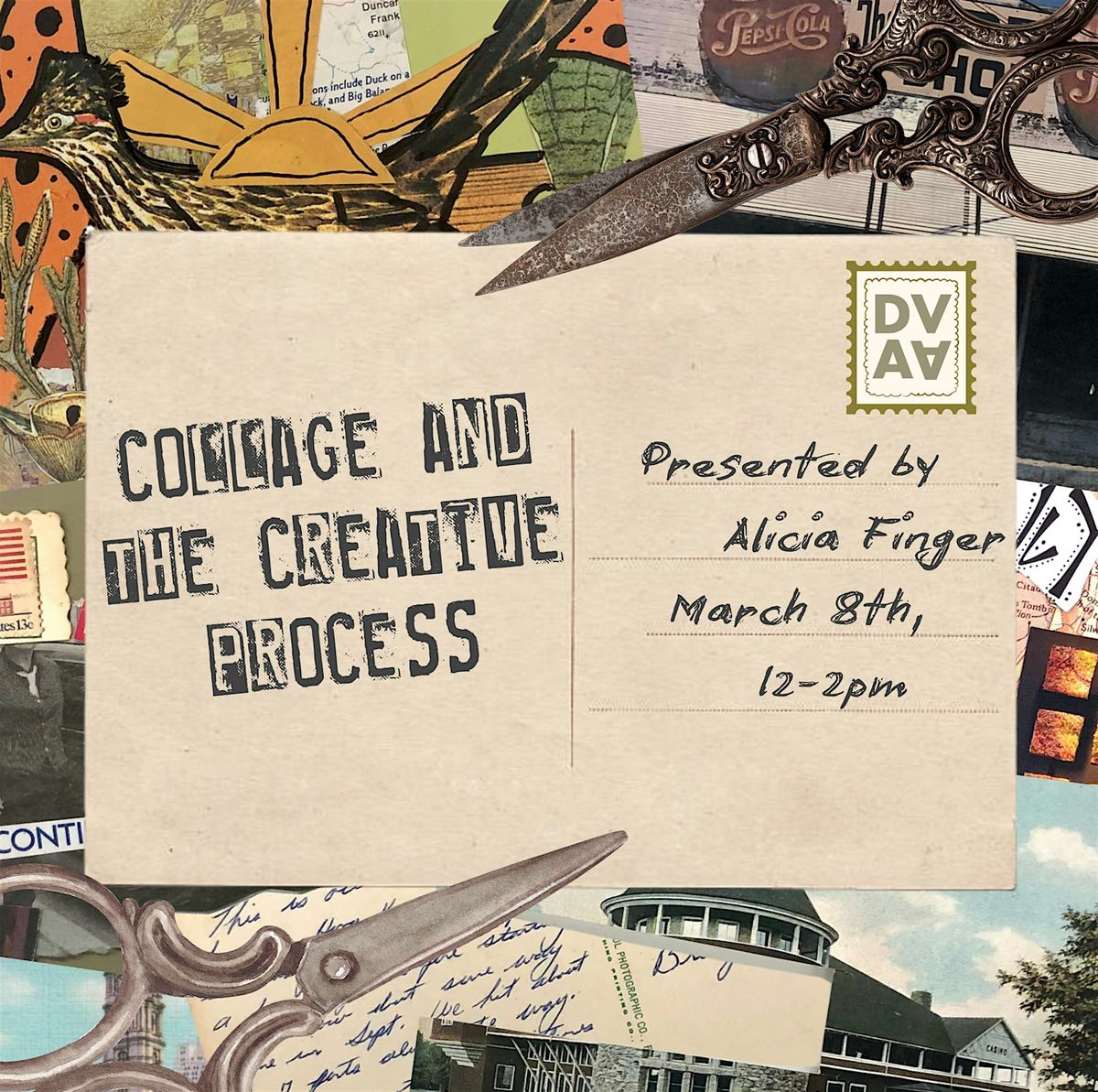 Collage and the Creative Process is a collage-making workshop exploring the process of reactive art making, memory, and connection, taught by exhibiting artist Alicia Finger. During this workshop, each participant will be given a used vintage postcard as the inspiration for their collage and will create a response piece using a range of provided materials. This workshop is inspired by Alicia's love for storytelling and collecting old postcards from thrift shops. She has created this workshop as an opportunity for participants to create a small collage, continuing the conversation.