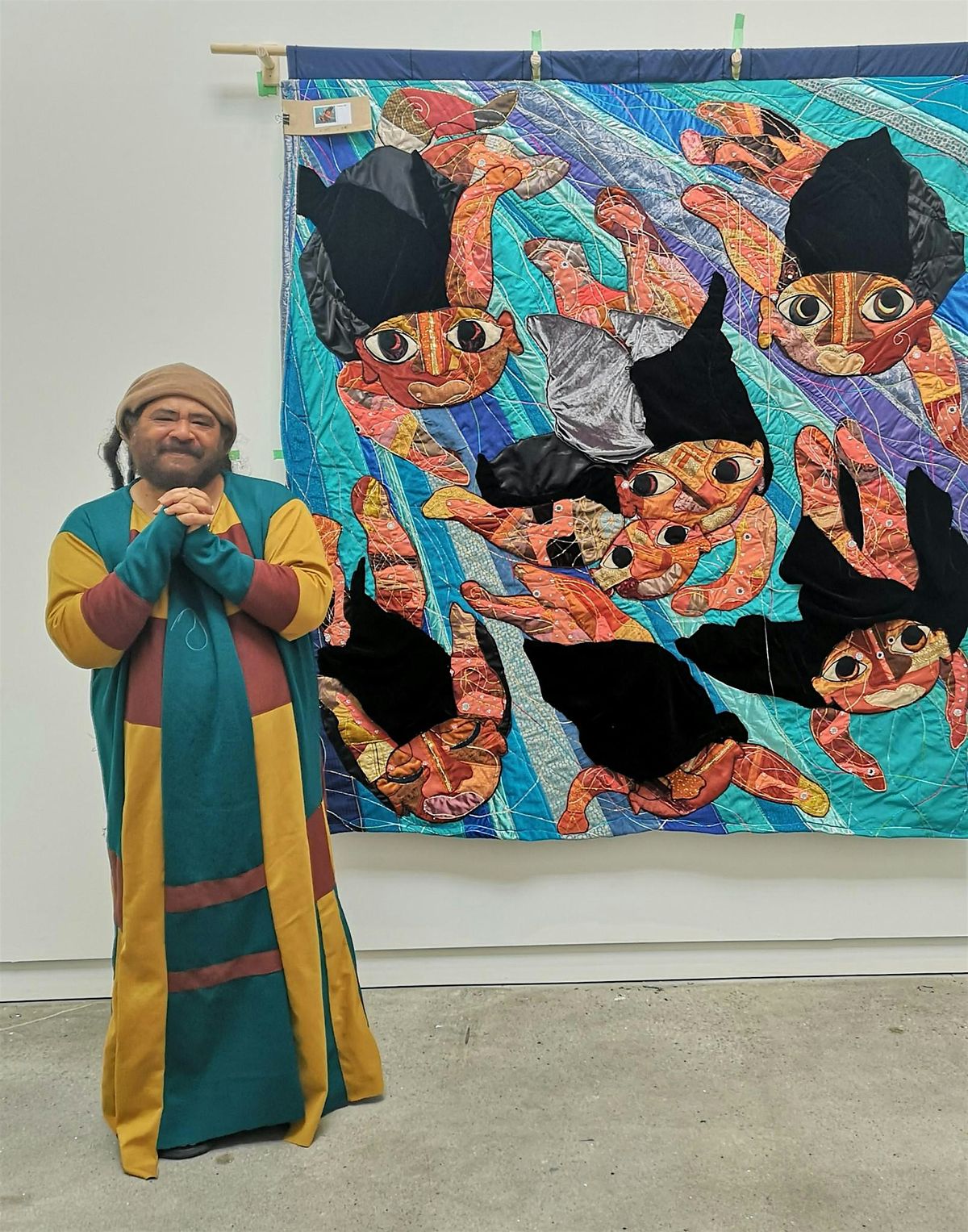 Matua Ron has been creating joyful clothing and art for over 40 years. His very first exhibition, Bitter and Twisted (1992), was held in The Dowse. His quilt Hīnātore is currently featured upstairs in Softy — a beautiful continuation of his creative journey with the gallery.