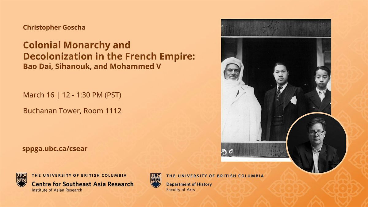 The Vietnamese emperor Bao Dai has gone down in history as a colonial puppet. He lies today beneath a black, nondescript tomb- stone in a Parisian cemetery. Meanwhile, millions of visitors stream through ornate monuments in Rabat and Phnom Penh to pay homage to the fathers of the Moroccan and Cambodian nations, Mohammed V and Norodom Sihanouk. The French had crowned them all as their colonial monarchs during the colonial period, but only two became the national icons of their post-colonial states. Why did some colonially conceived monarchs survive decolonization while others did not? In this talk, Christopher Goscha will try to provide a few possible answers to that question using a comparative framework of analysis.