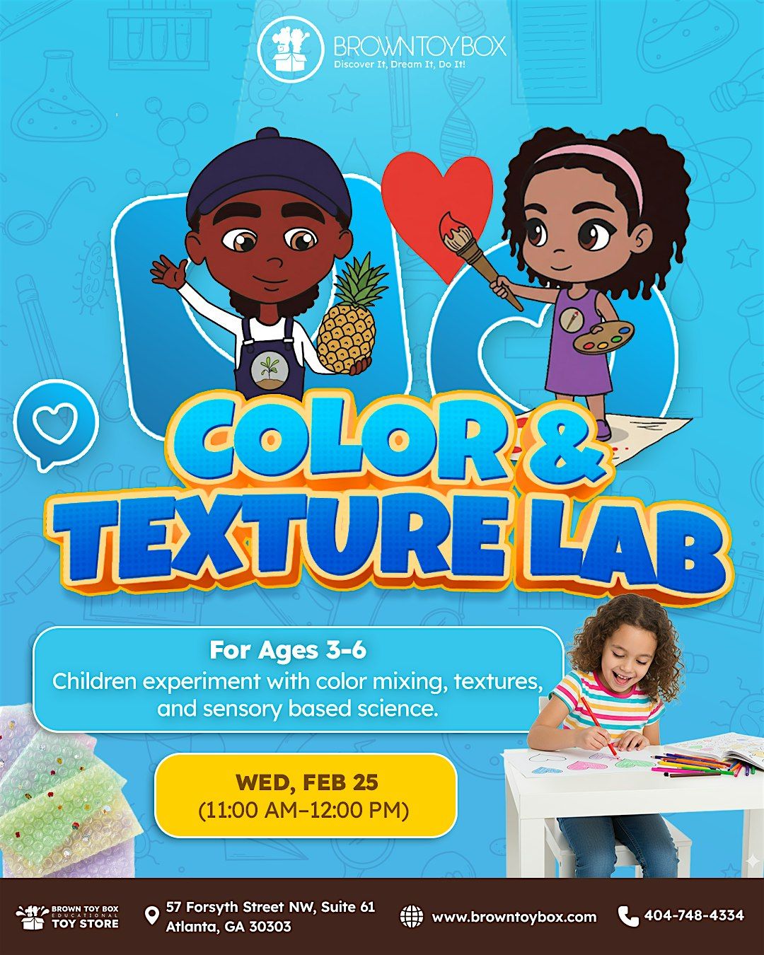 In this guided lab-style experience, children will experiment with color mixing, explore a variety of textures, and engage in sensory-based activities that encourage curiosity, fine motor skills, and early problem-solving. Through playful art and simple science exploration, participants learn by touching, seeing, and creating in a safe and supportive environment.