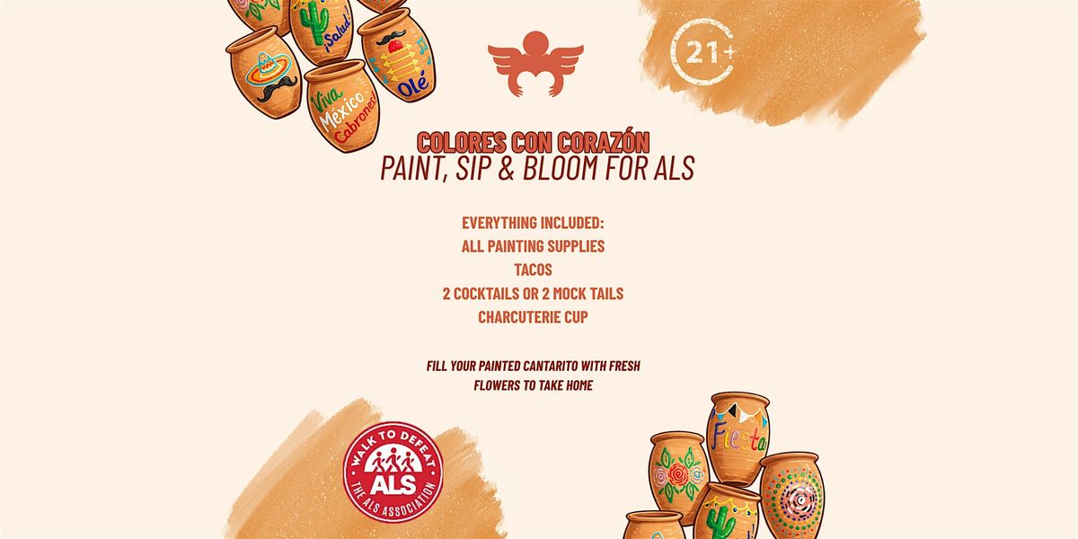 Join us for Colores Con Corazón: Paint, Sip & Bloom for ALS—a fun and meaningful 21+ experience where creativity meets a great cause. Enjoy a relaxed, social atmosphere as you paint your own beautiful cantarito, sip on cocktails or mocktails, and indulge in delicious tacos and a charcuterie cup.