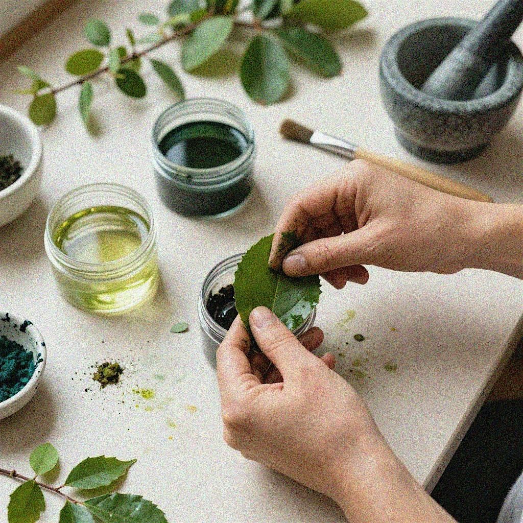 Come materia colorante, la foglia di coca rivela una straordinaria ricchezza cromatica che varia profondamente in base al metodo di lavorazione. La foglia fresca, estratta in ambiente acido e a bassa temperatura, rilascia una gamma di verdi brillanti e muschiati. Con l'essiccazione prolungata e l'alcalinizzazione — tradizionalmente ottenuta con cenere o calce, come nella pratica del chacchado — il pigmento vira verso bruni caldi e terrosità. La fermentazione o l'esposizione al calore spinto porta infine a toni rossastri e ramati, evocativi della terra stessa delle Ande.