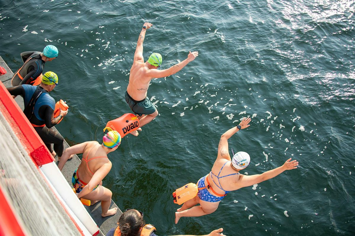 Swimmers board the famous Sternwheeler paddleboat on the south shore of the Columbia River, at the dock in Cascade Locks, and are ferried to the Washington side of the river. When signaled, swimmers jump off the Sternwheeler into the Columbia and swim an approximately 1.1-mile stretch across to Cascade Locks. To help them find their way, a special swim lane lined with volunteers in sailboats, kayaks, and paddle boards are there to guide, encourage, and protect swimmers as they cross the channel.
