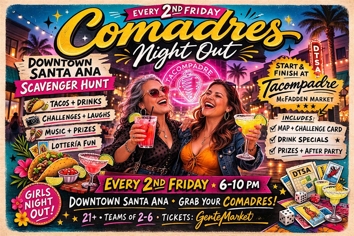 Start the night at Tacompadre inside McFadden Market, where you’ll check in and receive your Comadres Map + Challenge Card. From there, you and your group will explore Downtown Santa Ana, complete fun challenges, and visit featured stops along the way.