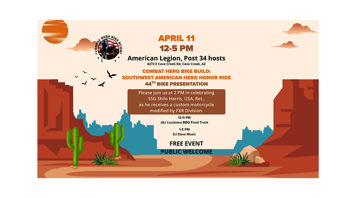 Join CHBB at American Legion Post 34, 6272 E Cave Creek Rd, Cave Creek, AZ, on April 11 from 12-5 PM as we celebrate SSG SHILO HARRIS, USA, RET., receiving his custom motorcycle modified by FXR Division.This bike presentation is a kickoff for the Inaugural Combat Hero Bike Build: Southwest American Hero Honor Ride, starting in Cave Creek on April 12, 2026, and ending in Boerne, TX, on April 16.