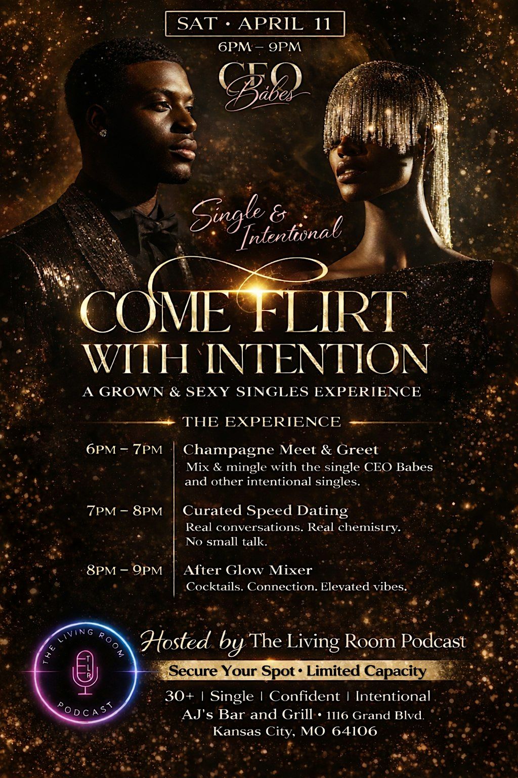 Hosted by The Living Room Podcast at AJ’s Bar & Grill in Kansas City, this exclusive event is for singles who are confident, emotionally available, and ready to date with purpose.
