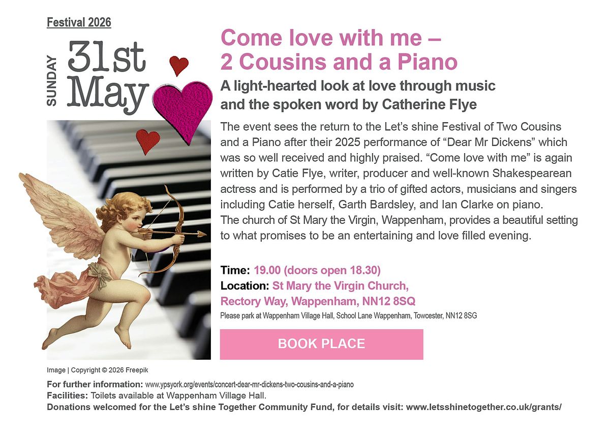The event sees the return to the Let's Shine Festival of Two Cousins and a Piano after their 2025 performance of "Dear Mr Dickens" which was so well received and highly praised. "Come love with me" is again written by Catie Flye, writer, producer and well-known Shakespearean actress and is formed by a trio of gifted actors, musicians and singers including Catie herself, Garth Bardsley and Ian Clarke on piano. The church of St Mary the Virgin Wappenham provides a beautiful setting to what promises to be an entertaining and love-filled evening.