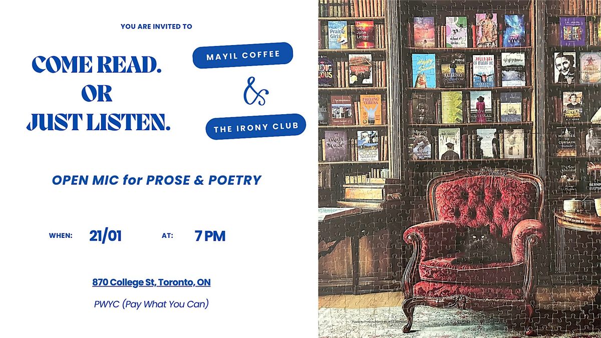 The Irony Club Open Mic at Mayil Cafe is a welcoming space for prose and poetry, with five-minute readings, no critique, and no pressure to impress. After the readings, we can stay, talk, drink coffee or cocktails, and let the night unfold. Everyone welcome.