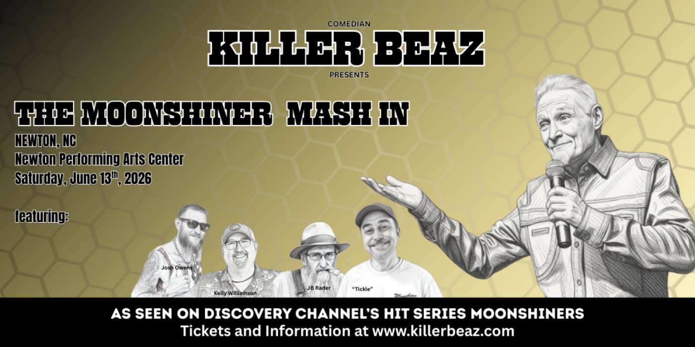 Celebrating 15 seasons of Discovery Channel's hit series Moonshiners, Killer Beaz is bringing “The Moonshiner Mash In” to the Newton Performing Arts Center in Newton, North Carolina. Appearing with Beaz, for this special show, will be Moonshiners Steve “Tickle”, Josh Owens, JB Rader, and Kelly Williamson for a session of question and answer and storytelling. Don't miss this special celebration with your favorite Moonshiners! Beaz continues to make regular stops to The Grand Ole Opry, and his outrageously funny , standup comedy show will be on stage, along with his Moonshiner buddies, at the Newton Performing Arts Center in Newton, North Carolina, Saturday, June 13th at 7:00 PM Tickets and information are available at www.KillerBeaz.com.
