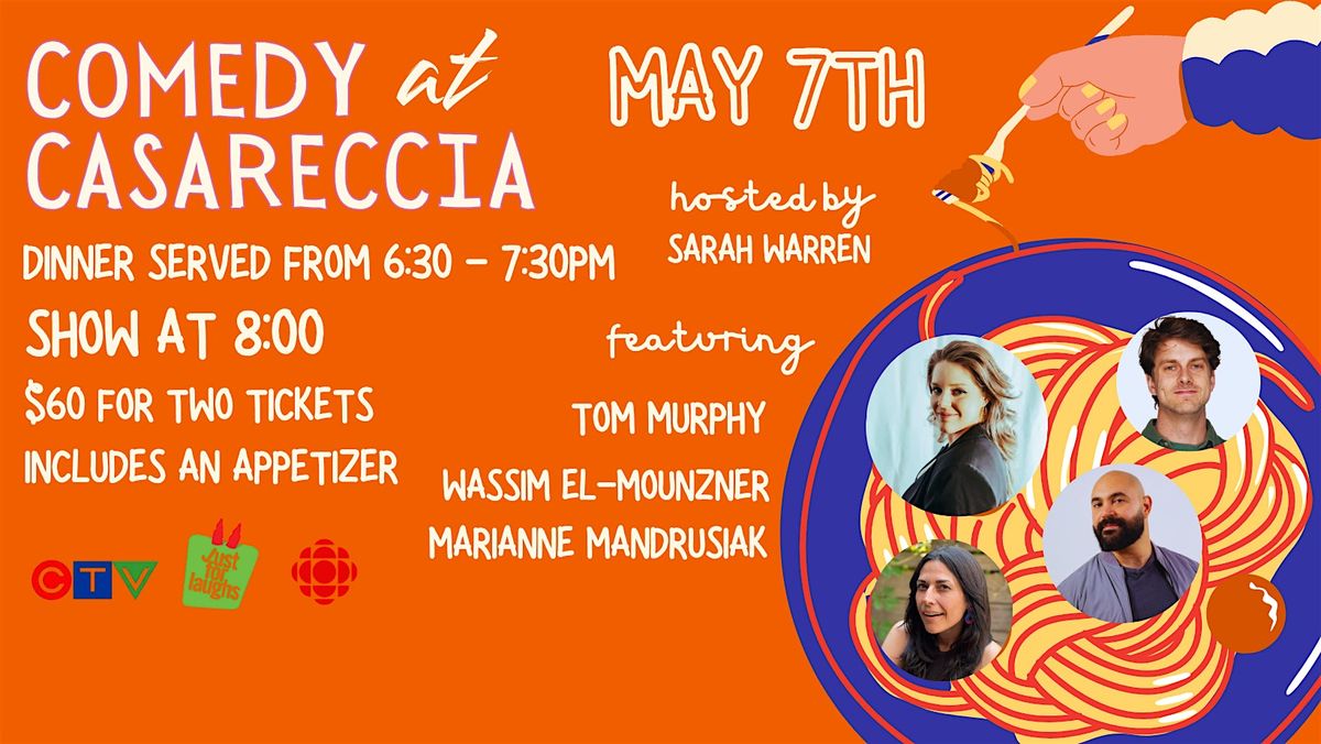It's Thursday, you've just finished work and gotten home, you're tired. This week has been kicking your ass. All day you've been looking forward to knowing that you don't have to cook yourself dinner tonight, finally! You have tickets to Comedy at Casareccia! You know that you're meeting your friend there because you definitely took advantage of the Two Ticket Special. You take 10 minutes to refresh yourself and another 20 to doomscroll on the couch. At 6:30pm you dance your way down to Pasta Casareccia and kiss your friend on the cheek. You head to the back room where you're seated and served the house appetizer that was included in your ticket. You also order the lasagna, or the osso bucco, maybe you're feeling a little flirty and you go for the classic tortellini in rosé sauce. You've had a delicious meal, and you've been able to catch up on all your life's dramas together. Then, at 8:00pm the show begins.
