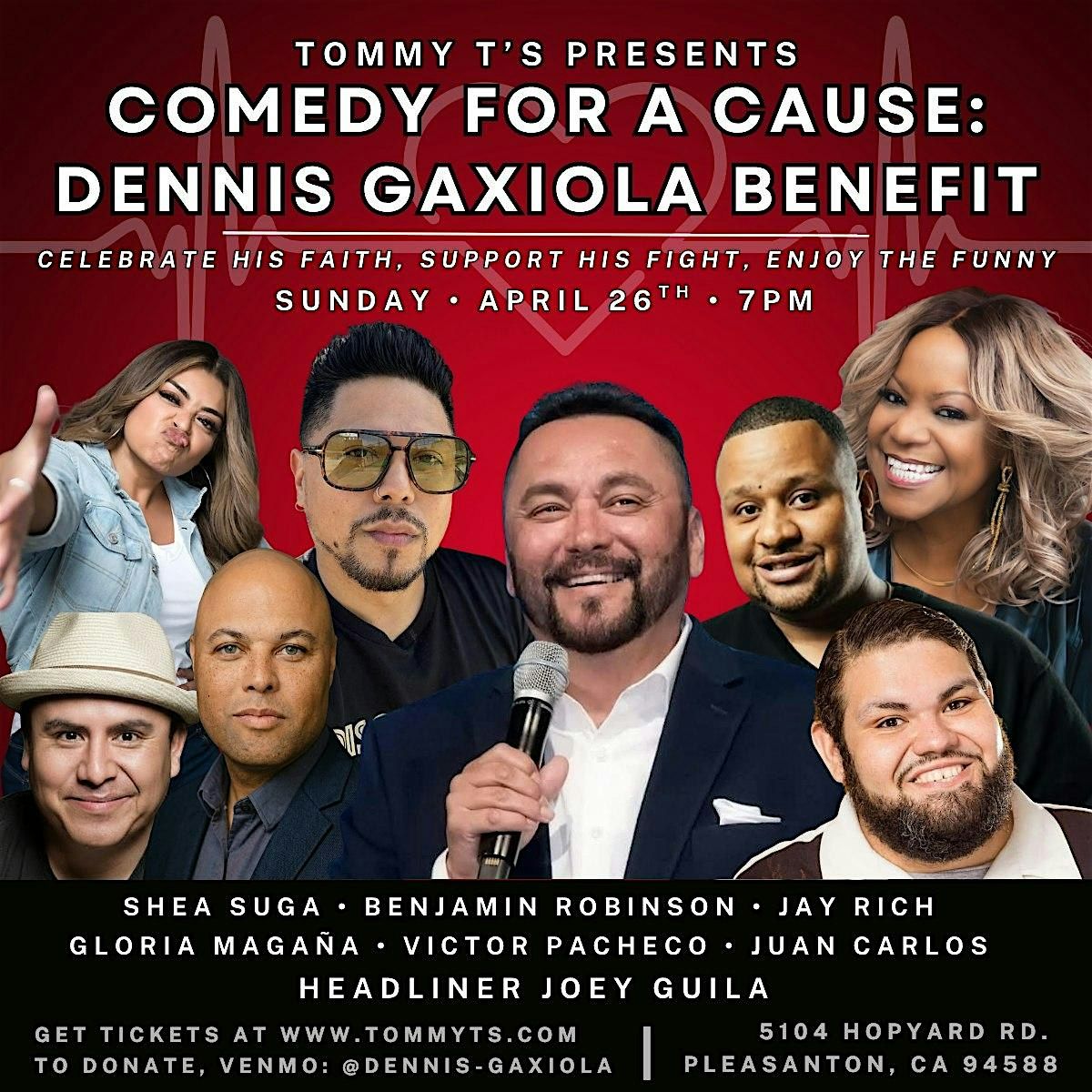 On April 26th, we invite you to come together at Tommy T’s for a special benefit show in his honor. A night of laughter, fellowship, and faith, headlined by Joey Guila and featuring Jay Rich, Gloria Magaña, Vic Pacheco, Juan Carlos, Benjamin Robinson, Shea Suga and special guests.