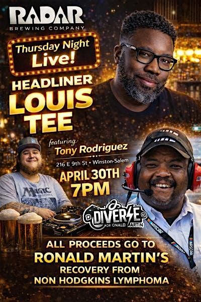 Come laugh until you cry, for a worthy cause! This one night comedy event will give it's proceeds to Ronald Martin's journey and recovery from Non-Hodgkin's Lymphoma, his most recent need is to attain a dependable car so he can work while he recovers and heals up. Nationally touring Headliner Louis Tee will be coming all the way from Wilmington, NC and Winston-Salem's very own Tony Rodriguez will be our headliner! Enjoy comedy, live DJ music, amazing drinks, and good vibes, that will help Ronald Martin recover and gain some traction in the game of life.