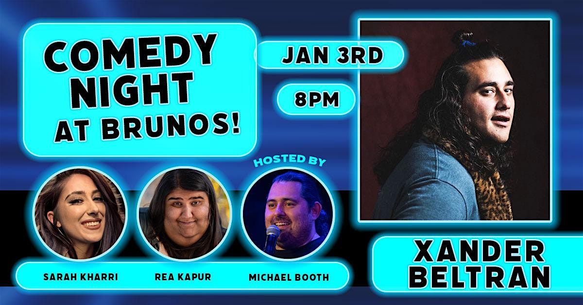 This month’s show at Bruno’s is a great way to kick off another year of comedy at one of the best spots to hang in Scott’s Valley, January’s show features Sarah Kharri, Rea Kapur, and headliner Xander Beltran.