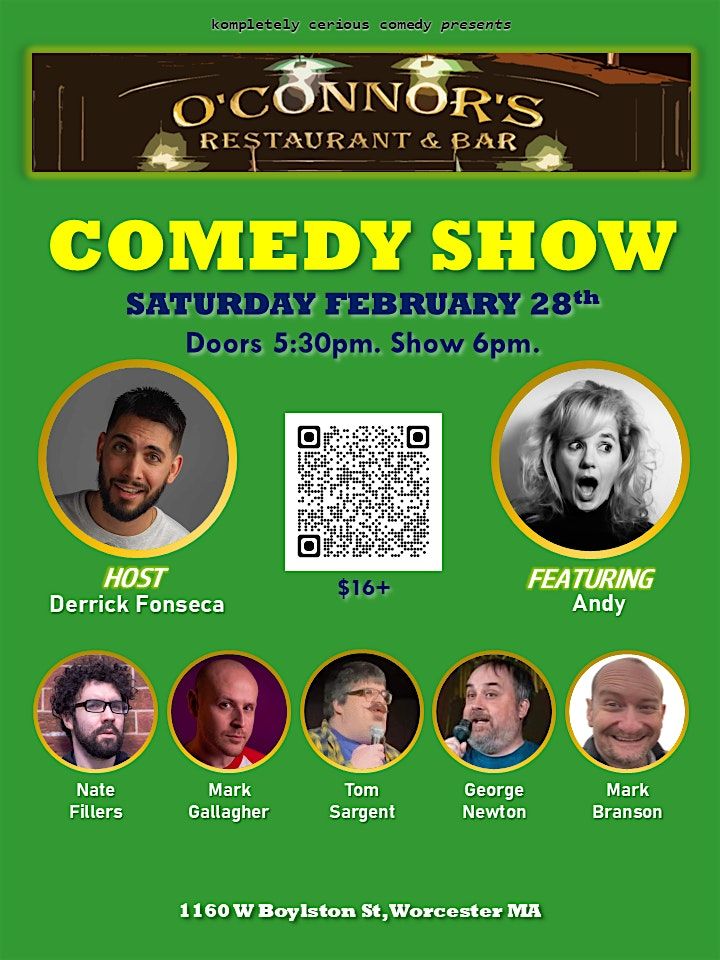 If you're looking to eat at O'Connors before the show, please make your reservations in advance. Please plan your reservation an hour minimum before the show. Drinks and a small select app menu will be offered during the show.Dinner Reservation Link-https://www.exploretock.com/oconnors-worcester