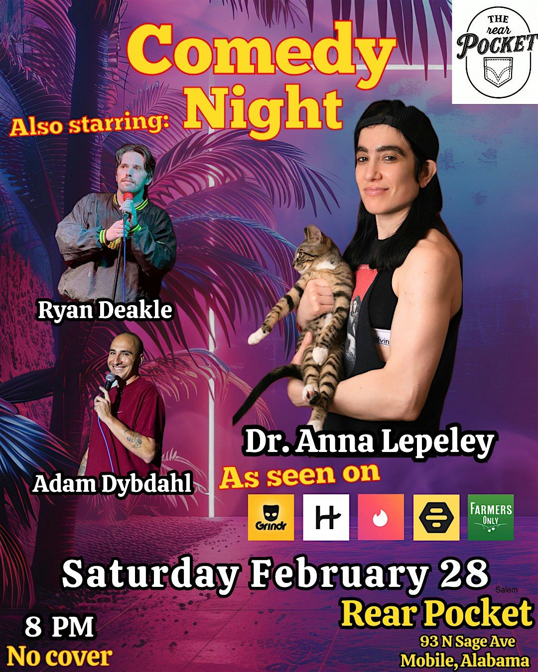 Saturday February 28 at Rear Pocket (NEW LOCATION), internationally touring comedian and author, Dr. Anna Lepeley, makes a stop in one of her favorite cities, Mobile, Alabama at one of her favorite venues with her favorite staff, Rear Pocket.