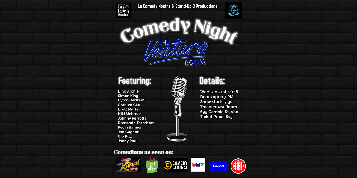 Welcome to Comedy Night At The Ventura Room! A showcase featuring the best Headliners in Vancouver doing their best 10 mins. Join us for a night of hilarious stand-up comedy in the coolest venue for comedy. You will be treated to Comedians that have been featured on Jimmy Kimmel Live, Just For Laughs, Comedy Central, CBC and more!