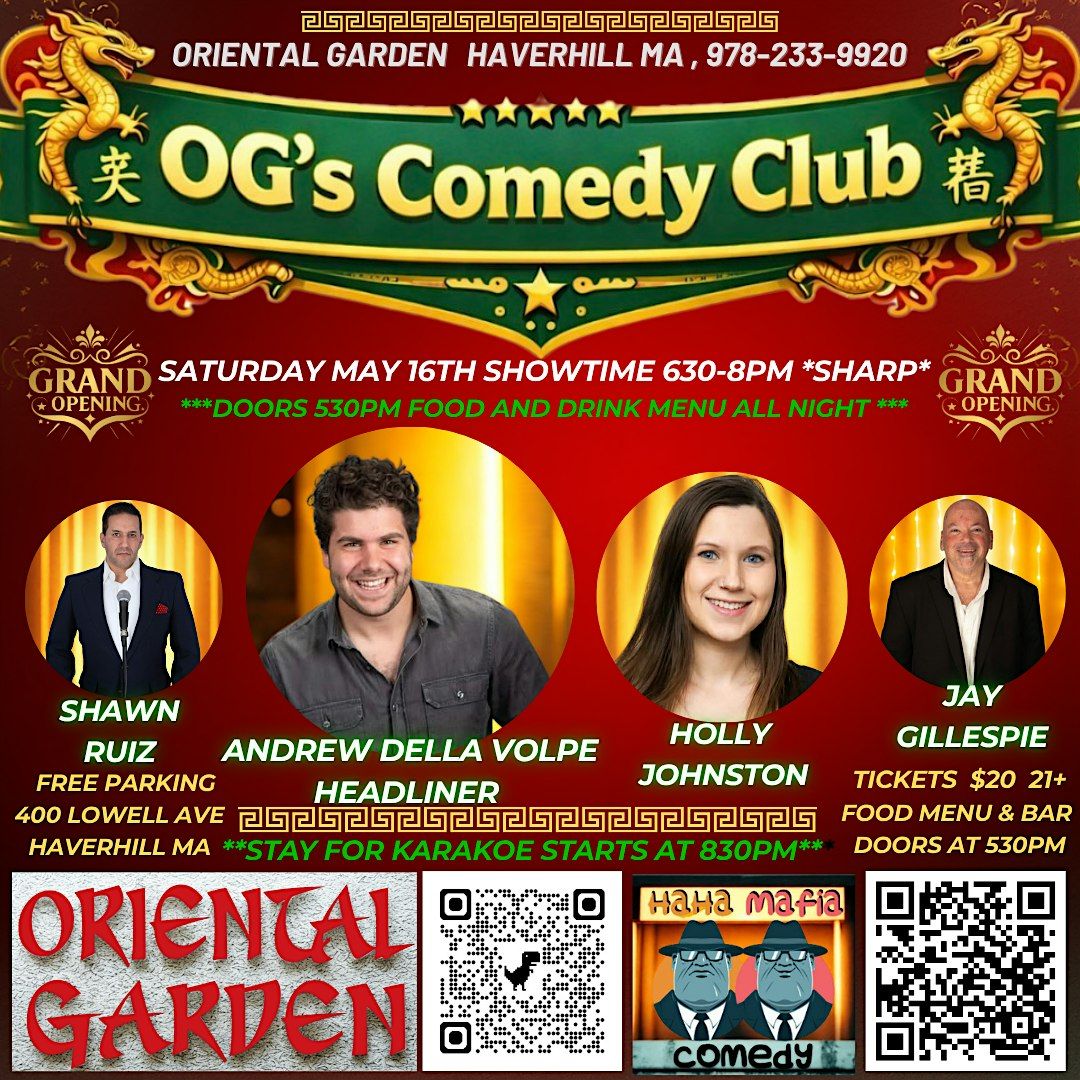 Join us live for our opening night at OG's Comedy Club located inside the Oriental Garden in Haverhill, MA. It's gonna be a night full of laughs, good vibes, and unforgettable fun. Don’t miss your chance to be part of the comedy scene as we kick things off in style. Bring your friends and let’s make it a night to remember! Bringing Boston and New England's Best and favorite comedians to Haverhill MA. Easy free Parking , less than 1/2 mile off exit 107 on 495 .... Great Food and Drinks , doors open at 530Pm for dinner , stay after the show for Karaoke .