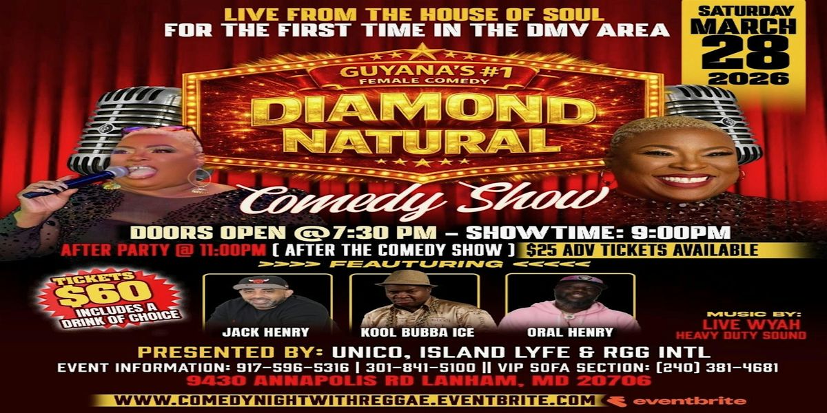 First time ever to DC brace yourselves for a night of non-stop laughter with the hilarious Diamond Natural Guyana's #1 female comedian based out of NYC! Known for her sharp wit and relatable, high-energy storytelling, Diamond is taking over House of Soul for a special, one-night-only headline set. Along with Co headliner Kool Bubba Ice known for over a 100 impersonations. Formely of DEF Comedy Jam and BET Comedic view just to name a few.