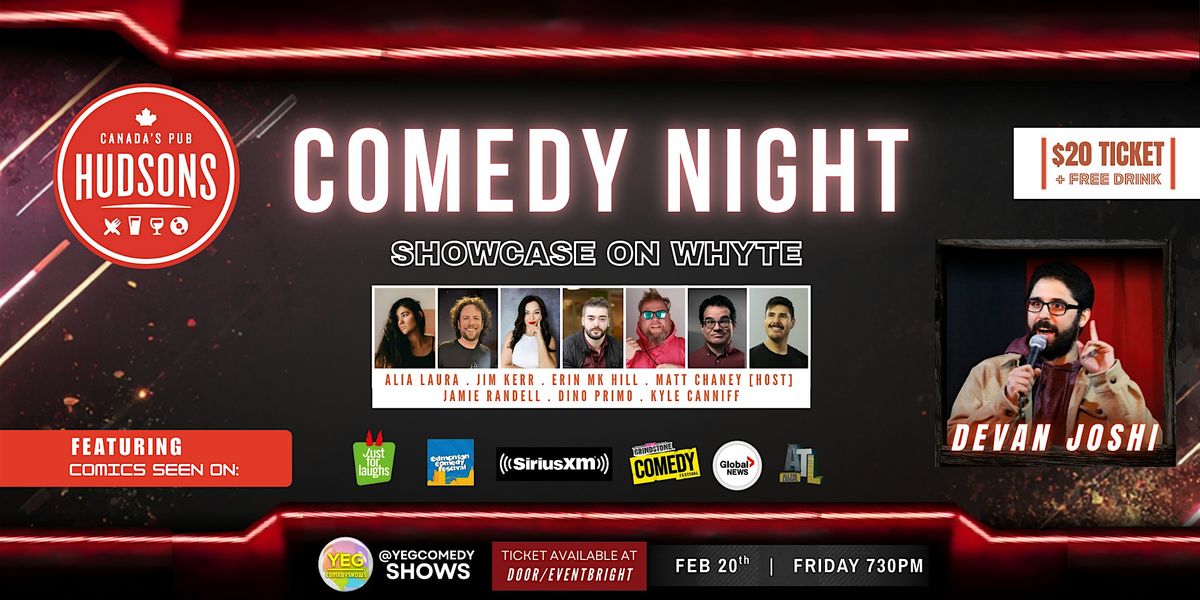 Edmonton's funniest take the stage at Hudsons on Whyte! Devon Joshi has performed all over north america including Hollywood Improve and The Comedy Store. On February 20th he headlines a showcase of professional comedians with credits that range from Just For Laughs, to CBC, and Kids in the Hall. Each ticket comes with a drink ticket. There's also a $32.99 steak and sip deal and $2 off signature cocktails. Don't miss this hilarious night out!
