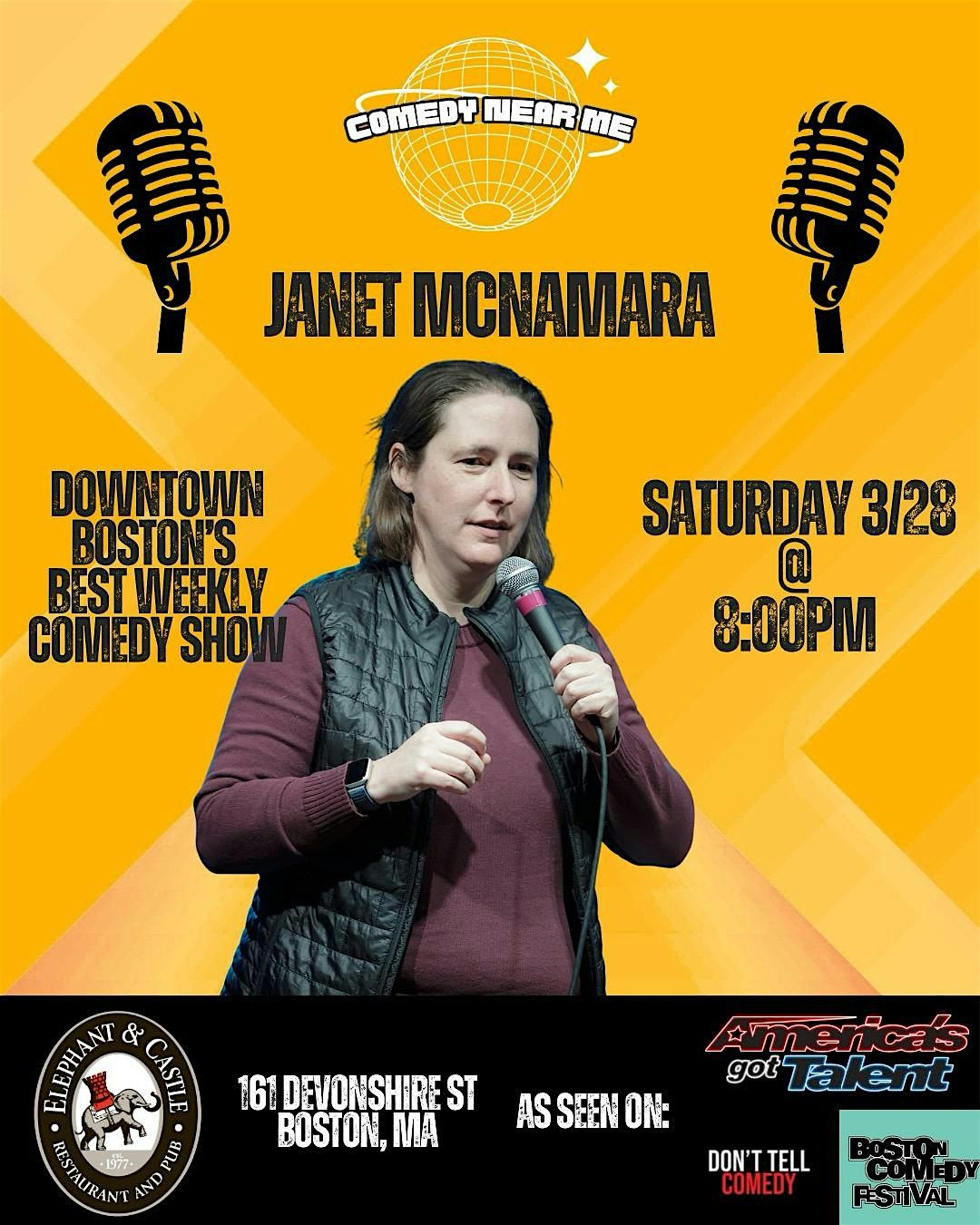 Downtown Boston Best comedy show at Elephant & Castle featuring Janet McNamara seen on Don’t Tell Comedy, Tik Tok & America’s Got TalentAbout this Event