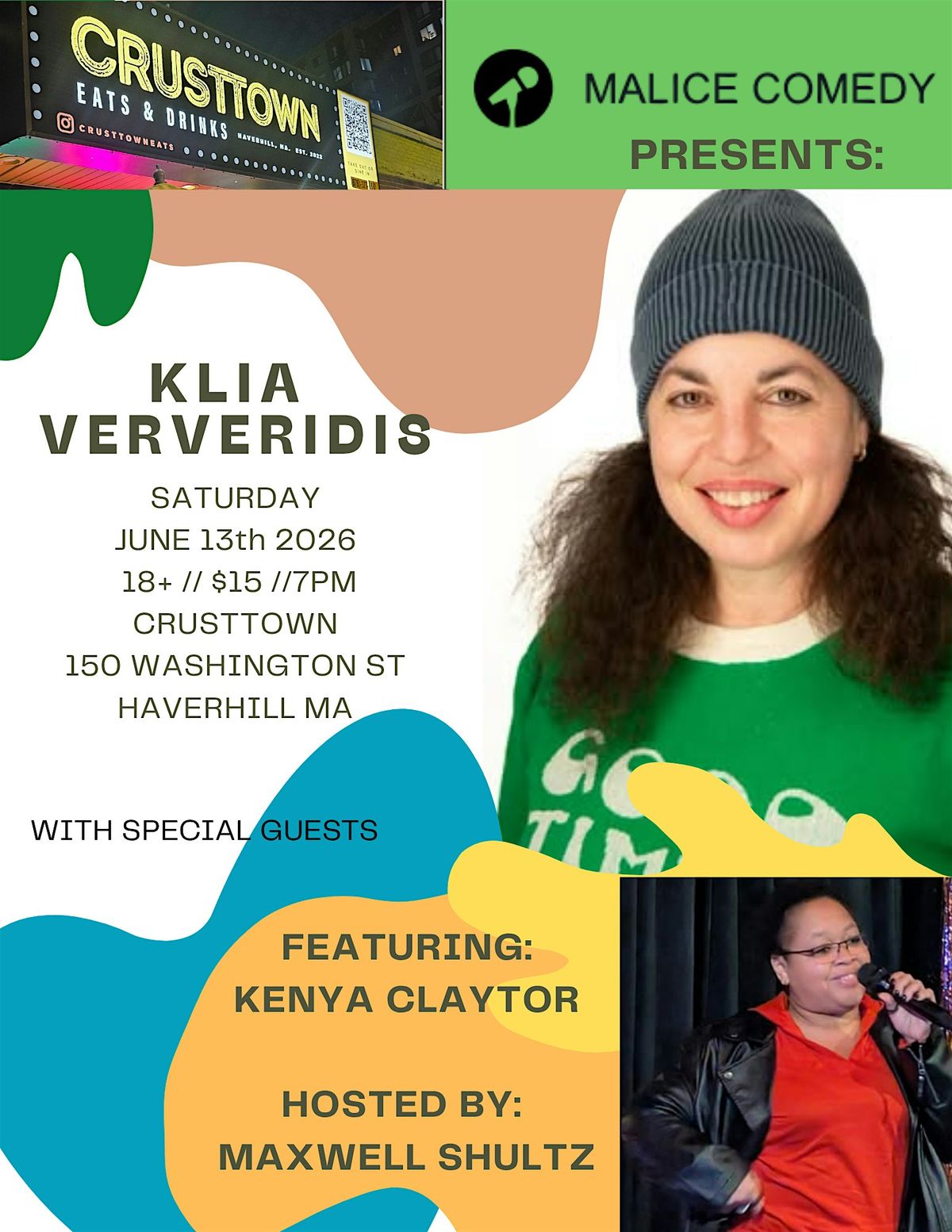 Klia Ververidis is a comedian that has appeared in venues across New England, New York City and New Jersey including the World Famous Copacabana. Klia is also an actor and has appeared on stage in numerous comedies including the roles of Mrs. Peacock in Clue and Klionice in Lysistrata with the Neverland Theater Company. She has appeared on various television shows including Chronicle and The Playboy Channel’s Morning Show. Klia draws inspiration for her comedy from the 25 years she spent practicing law and as a show promoter for antique shows and events. FB & IG @kliaismad