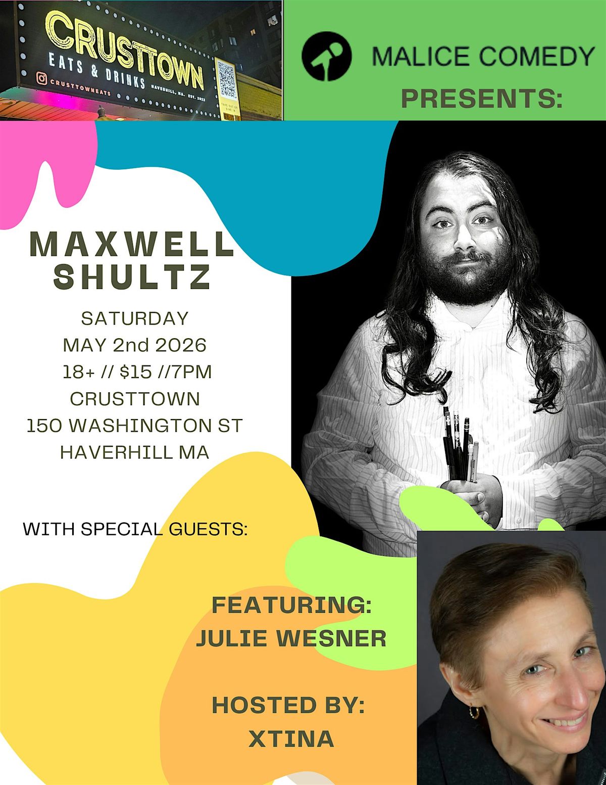 Maxwell Shultz is the owner and producer behind Malice Comedy, he has been headlined in New York, West Virginia, Tennessee, and all over New England. He is headlining the High Tide Comedy Fest in June 2026, and his 2025 filming, Ol' Peg A Leg is free on youtube!