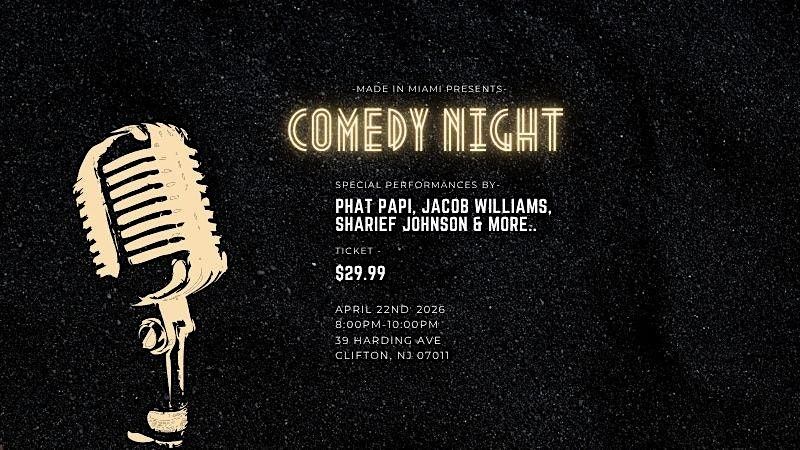 Get ready for a night of nonstop laughs at our live comedy show featuring a stacked lineup of talented comedians! Enjoy performances from 6 comedians, including standout acts like Phat Papi, Jacob Williams, Sharief Johnson, and Ester the Cuban Comedian.